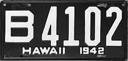 1942–45 | Embossed white on black; "HAWAII 1942" centered at bottom | Revalidated for 1943, 1944 and 1945 with windshield stickers, due to metal conservation for World War II. | ||