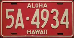 1957–60 | Embossed white on red with border line; "HAWAII" centered at bottom | "ALOHA" centered in white at top | 1A-123 A-123 A-1234 1A-1234 |