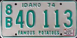 1974 | Embossed green serial on white plate with border line; "IDAHO 74" centered at top | "FAMOUS POTATOES" centered at bottom | A 12345 K A1234 0/A 12345 0/A A1234 1/A AB123 |