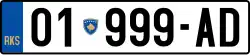 On 6 December 2010, a new design was introduced[3] containing the letters RKS (Republic of Kosovo) on a blue field, a two digit number corresponding to the districts of Kosovo, the coat of arms of Kosovo, a three-digit number and finally two serial letters.[4] The three-digit number starts at 101 and the serial letters start at AA. The remaining plates bearing the old design issued under UNMIK will be replaced with the new once their registration is pending renewal.