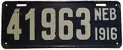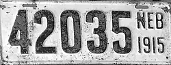 The U.S. state of Nebraska first required its residents to register their motor vehicles in 1905. Registrants provided their own license plates for display until 1915, when the state began to issue plates.[1]