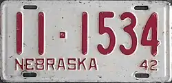 1942–44 | Red on white; "NEBRASKA 42" at bottom | none | 1-12345 10-1234 |