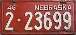 1946–47 | White on brick red; "46 NEBRASKA" at top | none | 1-12345 10-12345 |