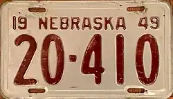 1949 | Maroon on unpainted aluminum; "19 NEBRASKA 49" at top | none | 1-12345 10-12345 |