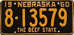 1960–61 | Golden yellow on black with border line; "19 NEBRASKA 60" at top | The Beef State | 1-123456 10-12345 |