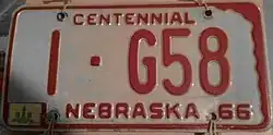 Coded by county of issuance (1 or 10) | Commemorated Nebraska's 100 years of statehood. Letters I, M, O, Q, W and X not used in serials; this practice continues today (except in Douglas, Lancaster and Sarpy Counties since 2002).[3] Revalidated for 1967 and 1968 with stickers. |