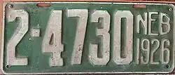 1926 | White on green; "NEB 1926" at right | none | 1-12345 10-1234 |