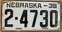1939 | Black on gray; "NEBRASKA – 39" at top | none | 1-12345 10-1234 |