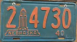 1940 | Orange on turquoise with State Capitol graphic; "NEBRASKA 40" at bottom | none | 1-12345 10-1234 |