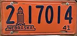 1941 | Dark blue on orange with State Capitol graphic; "NEBRASKA 41" at bottom | none | 1-12345 10-1234 |