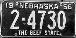 1956 | White on black with border line; "19 NEBRASKA 56" at top | The Beef State | 1-123456 10-12345 |