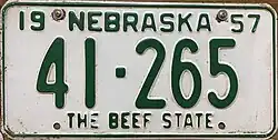 1957 | Green on white with border line; "19 NEBRASKA 57" at top | The Beef State | 1-123456 10-12345 |