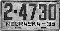 1935 | Black on gray; "NEBRASKA – 35" at bottom | none | 1-12345 10-1234 |