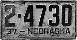 1937 | Black on gray; "37 – NEBRASKA" at bottom | none | 1-12345 10-1234 |
