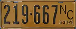 | 1925–26 | Embossed black serial on orange plate with border line; diagonal "NC" and "6-30-26" at right | none | 123-456 | 1 to approximately 348-000 | ||