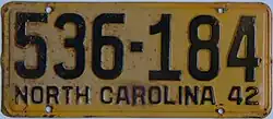 1942–43 | Embossed black serial on golden yellow plate; "NORTH CAROLINA 42" at bottom | none | 123-456 | 200-001 to approximately 762-000 | Revalidated for 1943 with black tabs, due to metal conservation for World War II. |
