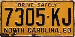 1953 | Embossed golden yellow serial on black plate; "NORTH CAROLINA 53" or "N.C.", slogan and "53" at bottom (see right) | none, or "DRIVE SAFELY" between state abbreviation and year | 123-456 | 100-001 to 760-000 |