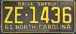 | 1961 | As 1957 base, but with "61 NORTH CAROLINA" at bottom | "DRIVE SAFELY" as on 1957 base | A-1234 AB-1234 |