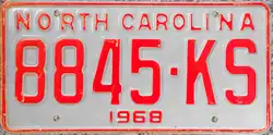 1968 | Embossed red serial on reflective white plate with border line; "NORTH CAROLINA" at top; "1968" centered at bottom | none | A-1234 AB-1234 |