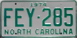 1974 | Embossed green serial on reflective white plate with border line; "1974" centered at top; "NORTH CAROLINA" at bottom | none | ABC-123 | AAA-101 to approximately JBA-999 |