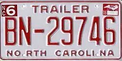 Trailer | 1995–present | Embossed red on white with border line; "NORTH CAROLINA" at bottom; "TRAILER" at top | AB-12345 | AN-10000 to AX-99999; BA-10000 to present |