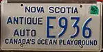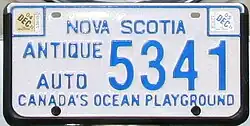 Antique Auto | Embossed blue serial on white plate; border lines around plate and around top corners; "NOVA SCOTIA" and "CANADA'S OCEAN PLAYGROUND" centred at top and bottom respectively, "ANTIQUE AUTO" on left side of number. | 1234 | 0001 to 9999 | ||
