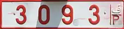 Vehicles belonging to the Palestinian Authority such as officials' cars, ambulances, fire brigade police and special military police use white number plates with red numbers in the XXXX format with leading zeros.
