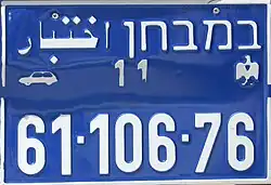 Test plates for garages and car importers are blue with white text and display the word "TEST" in Arabic (اختبار) and Hebrew (במבחן) above the number.