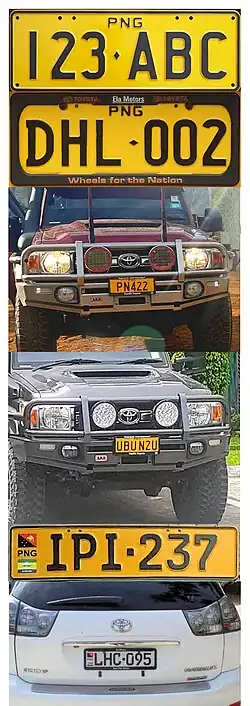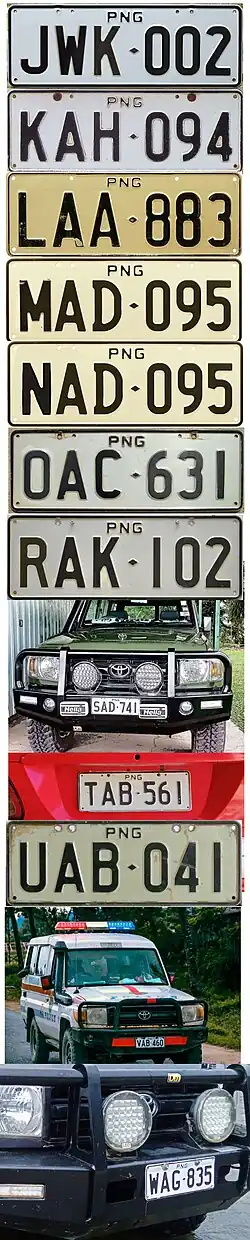 Papua New Guinea] (Papua Niugini in Tok Pisin) requires its residents to register their motor vehicles and display vehicle registration plates.[1] Motor vehicle registration is the responsibility of Motor Vehicle Insurance Limited (MVIL). Current plates are in two styles; Australian standard 372 mm × 134 mm, and use Australian stamping dies, and what is commonly referred to as "Euro Flag" style. The latter has the flag of Papua New Guinea and often a provincial flag from Morobe or Madang Province on the left. The stamping dies are German FE style.[2] Commencing in April 2025, flag style plates were no longer offered, reverting back to the standard Australian style. This commenced at LCG-000. Since the mid 1990s, plates have been issued with the first letter identifying the province of issue. As of 2025, most private and commercial motor vehicles use standard white plates with black lettering. Special number plates are issued to Consular staff, Diplomatic staff, Government owned vehicles, motorcycles, public motor vehicles (buses), taxis, trailers and to those engaged in selling or repairing vehicles. Especially in the provincial areas, many vehicles feature either just one plate, or a home-made alternative to replace a missing officially issued plate.