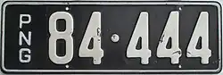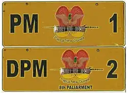 Registration plate used on vehicles belonging to the National Government of Papua New Guinea. Introduced in 1975 to reflect independence from Australia. | ![]() |