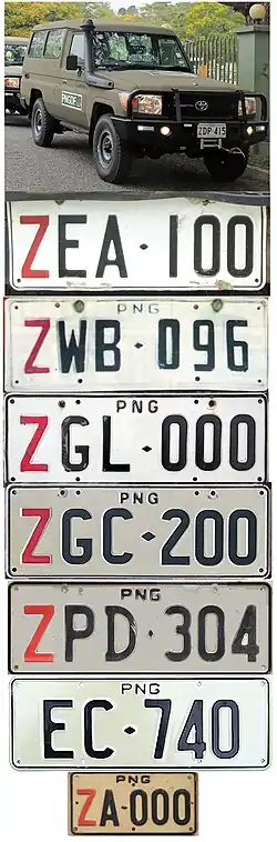 | Plates with a red Z and in the range ZPD-000 to ZPD-999 and ZPF-000 to ZPF-999 are issued to police vehicles of the Royal Papua New Guinea Constabulary. |