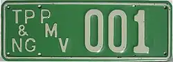Registration plate used on vehicles belonging to the Administration of the Territory of Papua New Guinea. | ![]() |