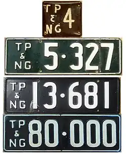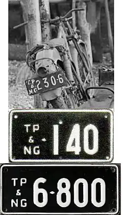 General issue motorcycle registration plates from TP&NG. Issued from 1951 to 1973. | ![]()