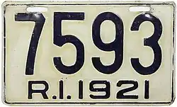 1919 | Black serial on white flat metal plate; "R.I. 1919" centered at bottom | none | 12345 | 1 to approximately 32000 | |