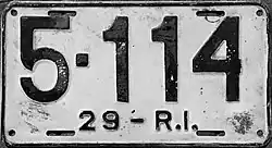1929 | Embossed black serial on white plate with border line; "29–R.I." centered at bottom | none | 123-456 | 1 to approximately 109-000 | |