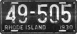 1930 | Embossed white serial on black plate with border line; "RHODE ISLAND 1930" at bottom | none | 123-456 | 1 to approximately 115-000 | First use of the full state name. |