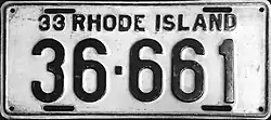 1933 | Embossed black serial on white plate with border line; "33 RHODE ISLAND" centered at top | none | 123-456 | 1 to approximately 117-000 | |