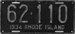 | 1934 | Embossed white serial on black plate with border line; "1934 RHODE ISLAND" centered at bottom | none | 123-456 | 1 to approximately 125-000 | ||