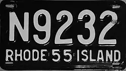1955–56 | Embossed white serial on black plate; "RHODE 55 ISLAND" at bottom | none | A1234 | B1 to Z9999 | Revalidated for 1956 with white tabs. |