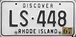1967–71 | Embossed black serial on non-reflective white plate with border line; "RHODE ISLAND" centered at bottom | "DISCOVER" centered at top | AB·123 | AA·100 to ZZ·999 (see right) |