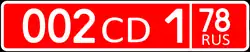 | Diplomatic cars have white characters on a red background. The first three digits on the plate are a code identifying the embassy to which they belong, assigned in order based on the date at which that country established diplomatic relations with the Soviet Union or post-Soviet Russia (but not Russian Empire, so it starts with the recognition of the Soviet Union by the Great Britain). For example, the United Kingdom is 001, the United States is 004, and South Sudan is 168. Numbers 500 and above identify international organizations, such as 505 for IMF. On ambassadors' cars this code is followed by CD and a digit (004 CD 1 77 rus), while cars assigned to rank-and-file diplomats have this code followed by D and three digits (for example, 004 D 108 77 rus). The lacking diplomatic status administrative and technical staff of embassies, consulates or international organizations have license plate format (004 T 001 77 rus). | |