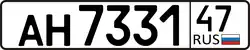 The current format uses a letter followed by 3 digits and two more letters. To improve legibility of the numbers for Russian cars abroad, only a small subset of Cyrillic characters that look like Latin characters are used (12 letters: А, В, Е, К, М, Н, О, Р, С, Т, У, Х), additionally D was issued on some very early plates.[1] Finally, the region number (77, 97, 99, 177, 197, 199, 777, 797 and 799 for Moscow; 78, 98, 178, and 198 for Saint Petersburg, etc.) and the international code RUS with the 1991 to 1993 Russian flag typically to the right of it, however the flag is not mandatory, and since 2013 owners may order plates without it.[2]