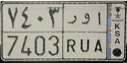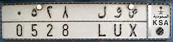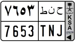 ![]() Current regular legal standard number plate from Saudi Arabia. | |