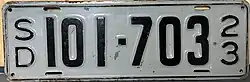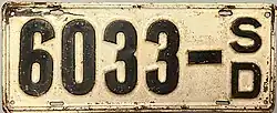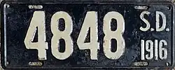 The U.S. state of South Dakota first required its residents to register their motor vehicles in 1905. Registrants provided their own license plates for display until 1913, when the state began to issue plates.[2]