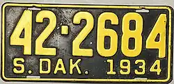 1934 | Embossed yellow on black with border line; "S. DAK. 1934" at bottom | none | 1-1234 10-1234 |