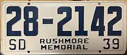 1939 | Embossed blue on white; "SD" at bottom left and "39" at bottom right | "RUSHMORE MEMORIAL" at bottom center | 1-1234 10-1234 |