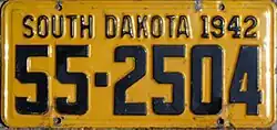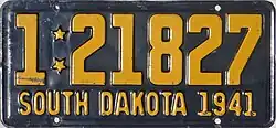1941 | Embossed golden yellow on black; "SOUTH DAKOTA 1941" at bottom | none | 1-1234 10-1234 |