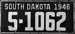 1946 | Embossed white on black with border line; "SOUTH DAKOTA 1946" at top | none | 1-1234 10-1234 |