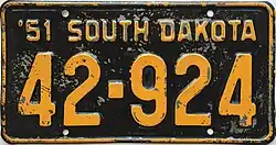 1951 | Embossed orange on black with border line; "'51 SOUTH DAKOTA" at top | none | 1-1234 1-A123 10-123 10-A12 10-1A2 10-12A |