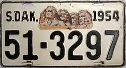 1954 | Embossed black on white with border line; "S.DAK.", Mount Rushmore decal and "1954" at top | none | 1-1234 1-A123 10-1234 10-A123 |
